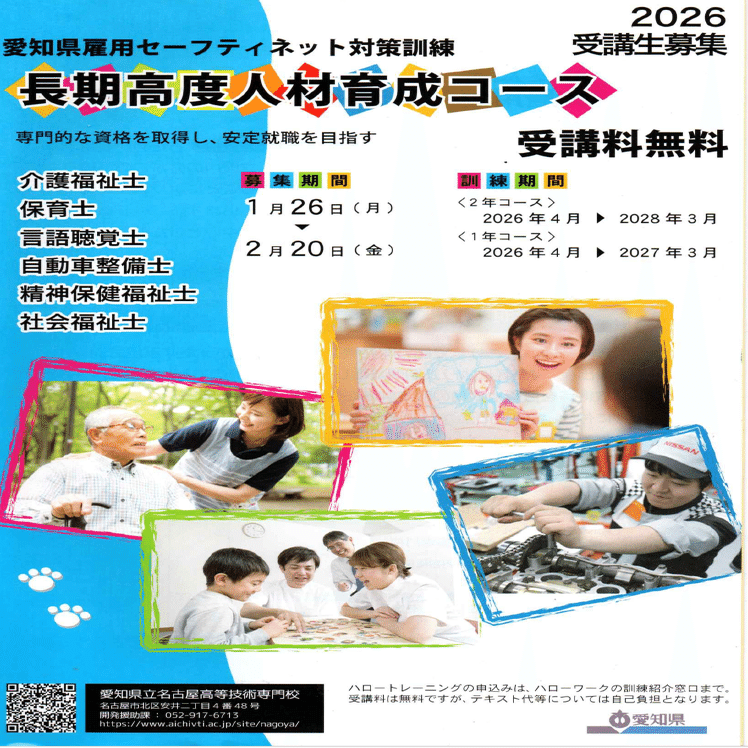 愛知県で2026年4月から開講する、離職者、若年未就労者の就職を支援するための雇用セーフティネット対策訓練(委託訓練)長期高度人材育成コースの委託先業者が決定しました。