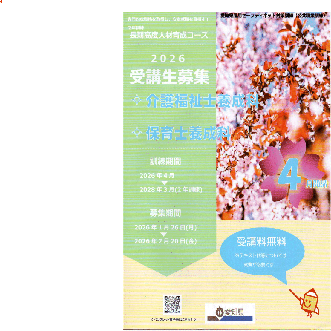 入校選考料及び受講料は無料です。