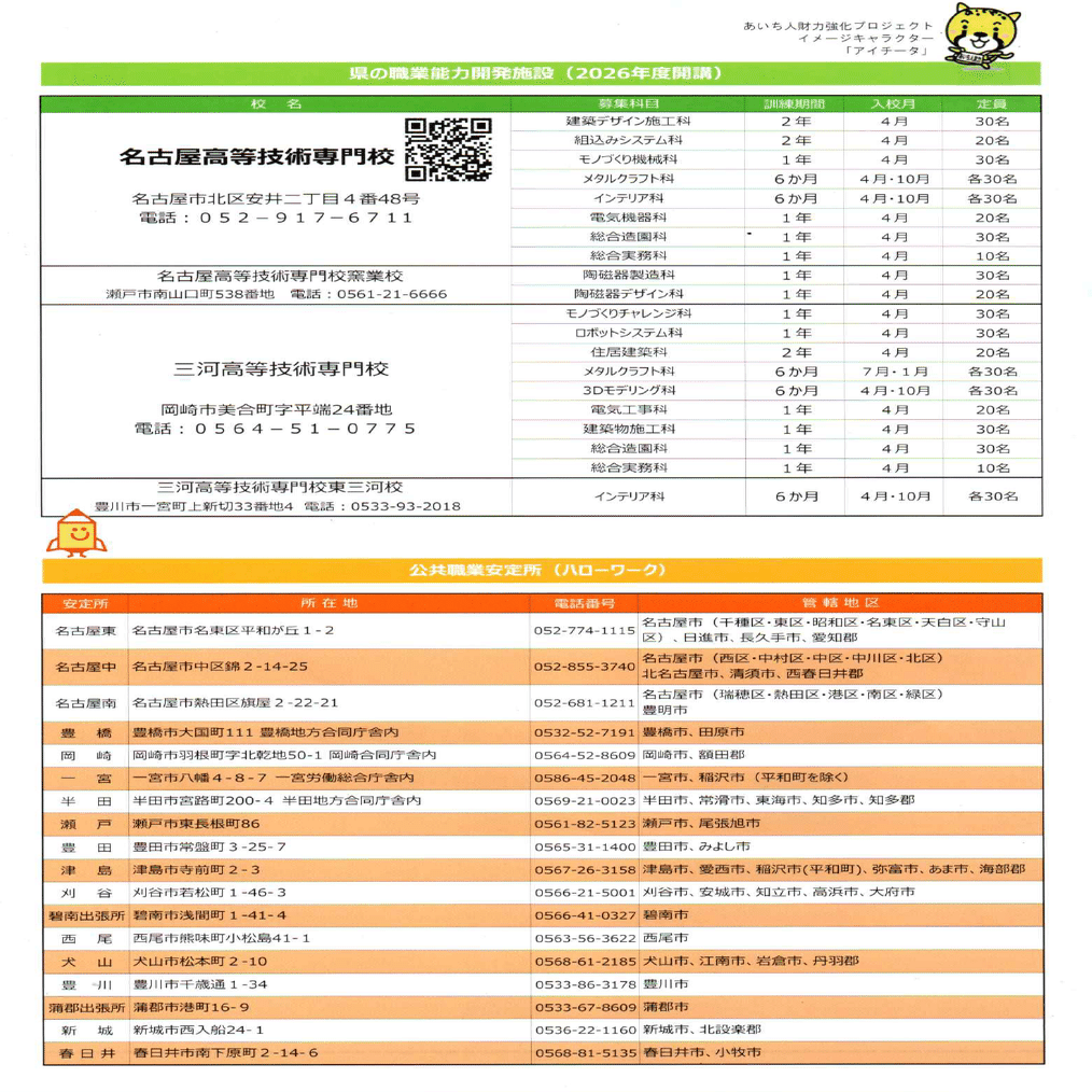 以下、名古屋高等技術専門校、三河高等技術専門校の募集校をお知らせしますね。
